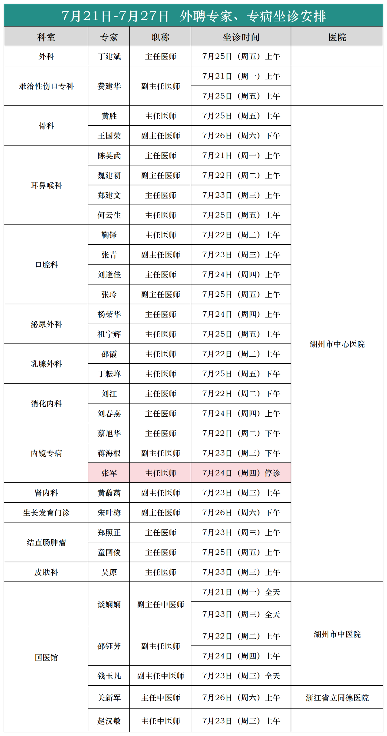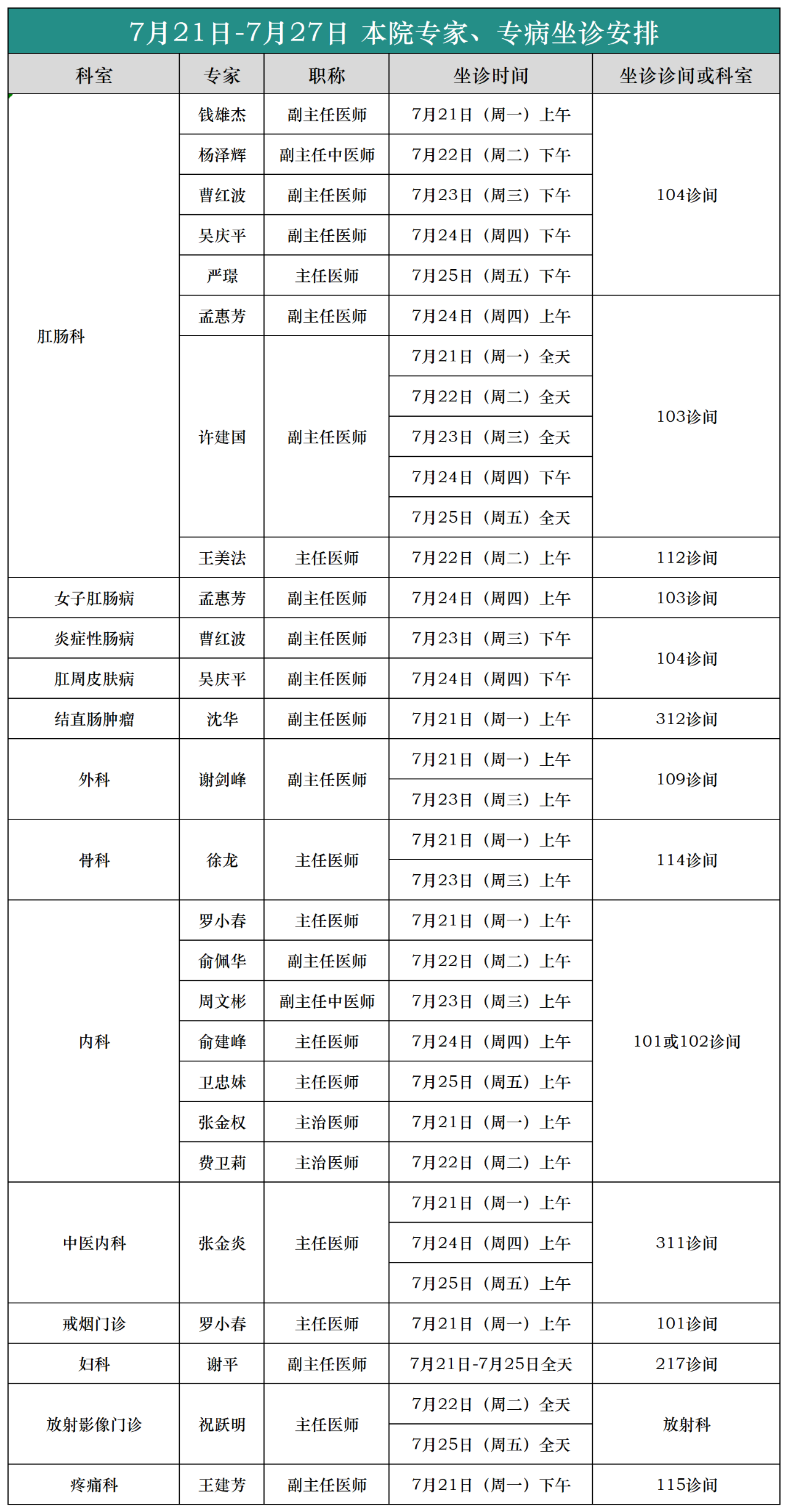 (7月21日-7月27日)外聘专家、专病坐诊安排