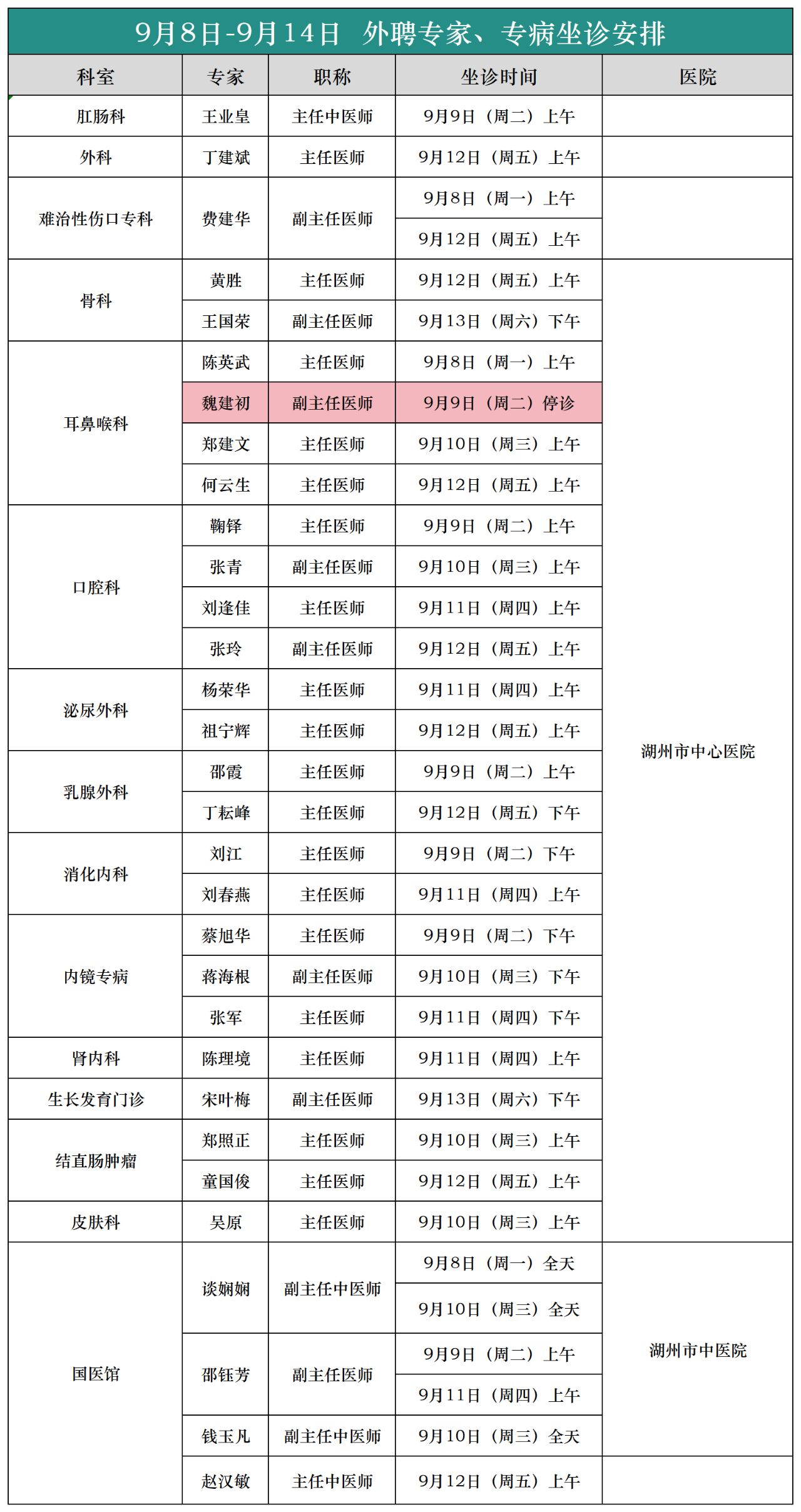 【专家|医讯】吴兴区中西医结合医院(9月8日--9月14日)专家、专病门诊安排