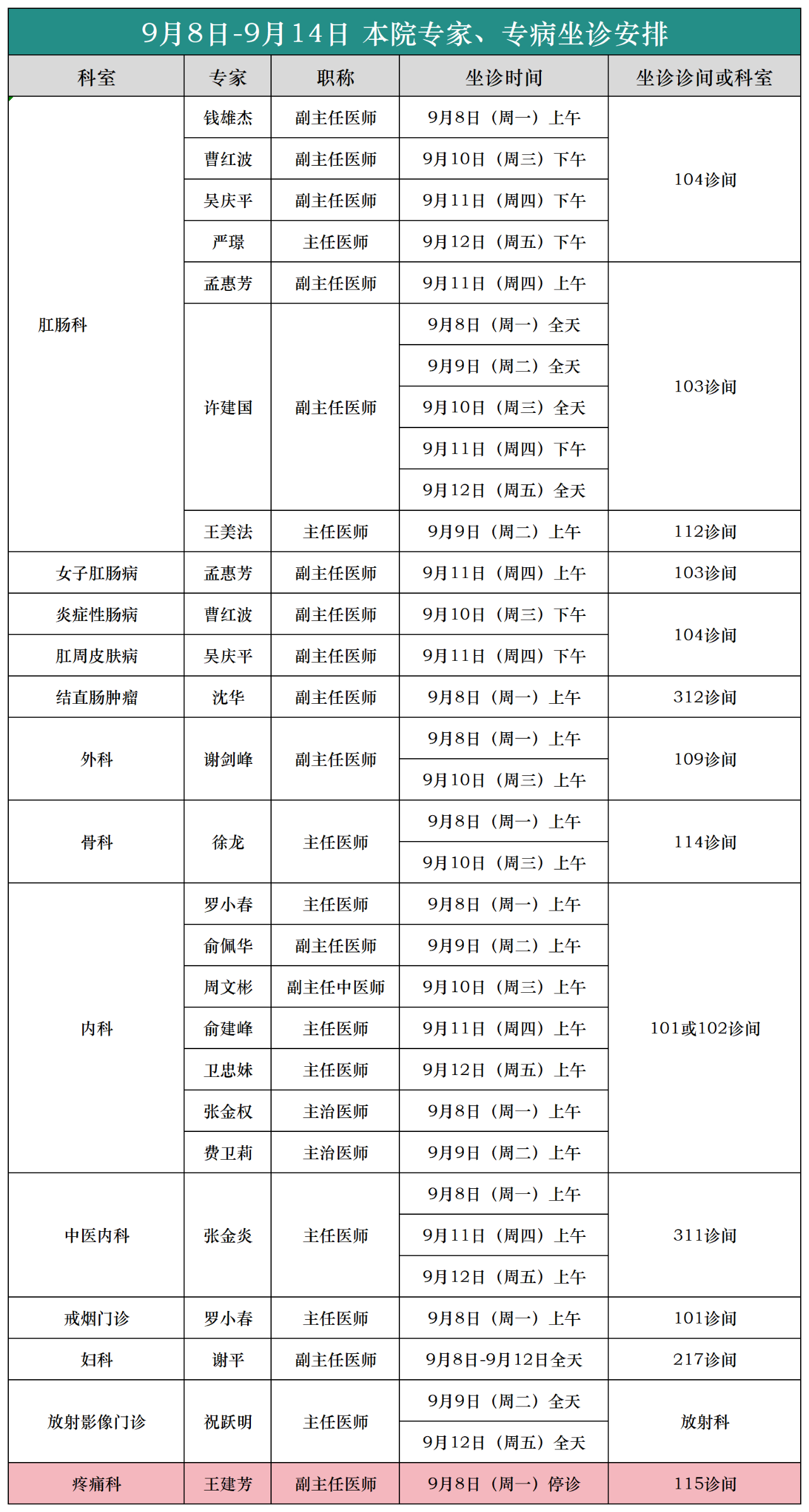 (9月8日-9月14日)外聘专家、专病坐诊安排