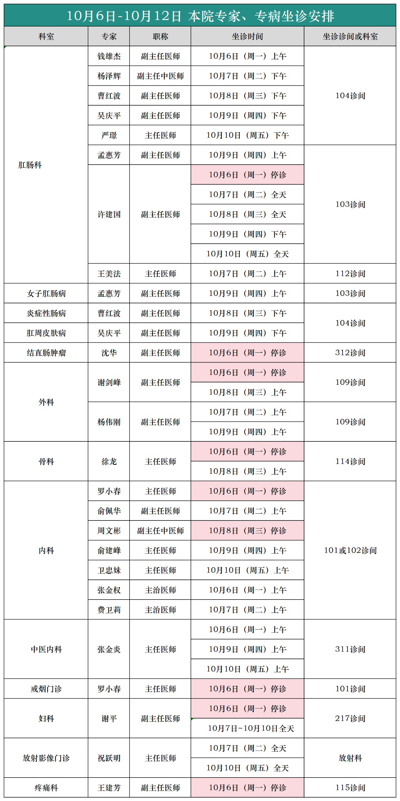 (10月6日-10月12日)外聘专家、专病坐诊安排