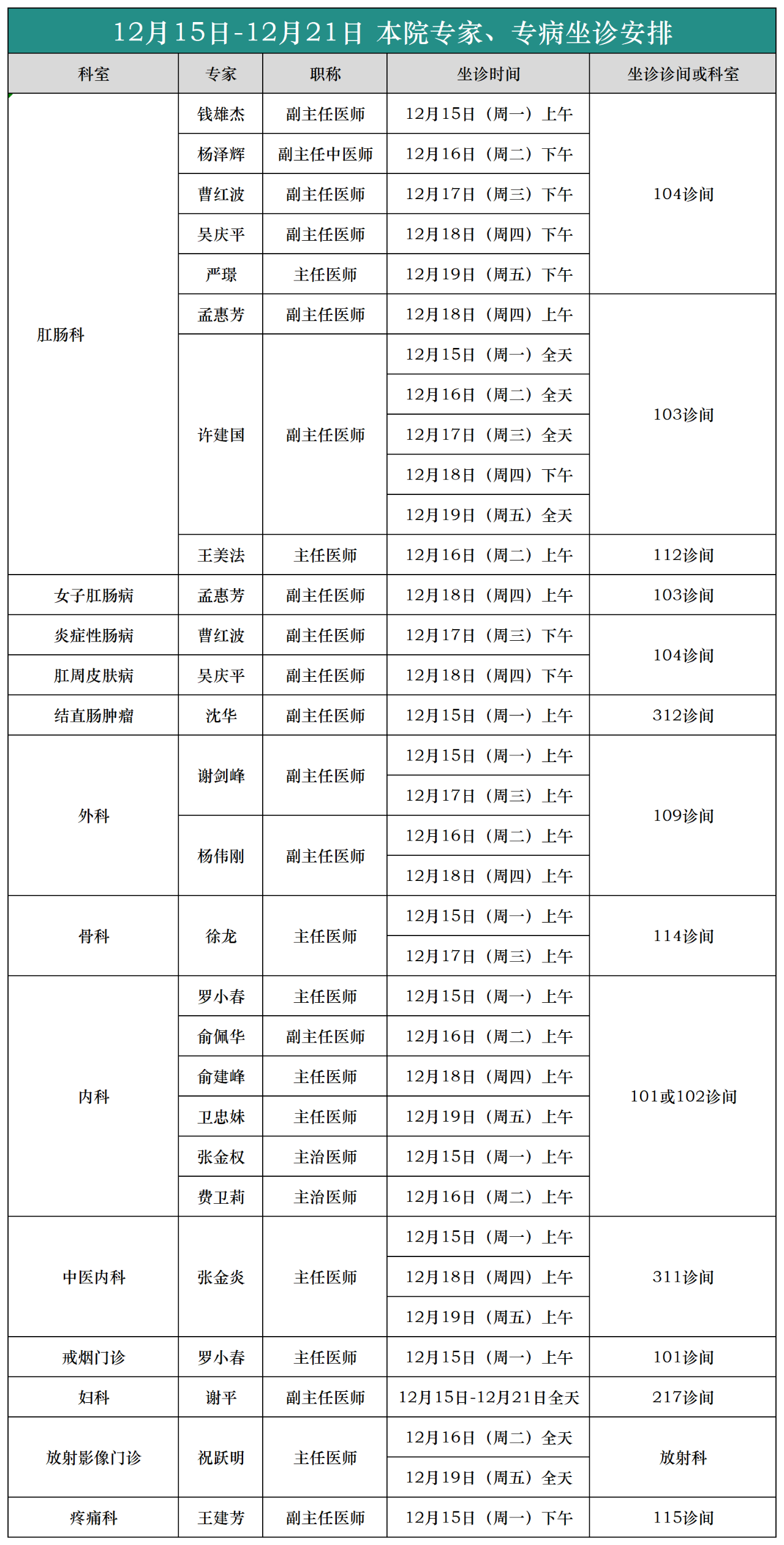 (12月15日-12月21日)本院专家、专病坐诊安排