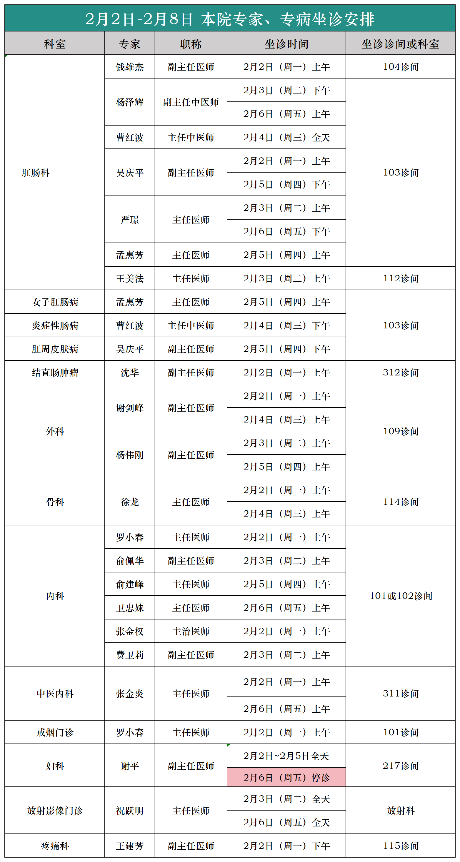 (2月2日-2月8日)本院专家、专病坐诊安排