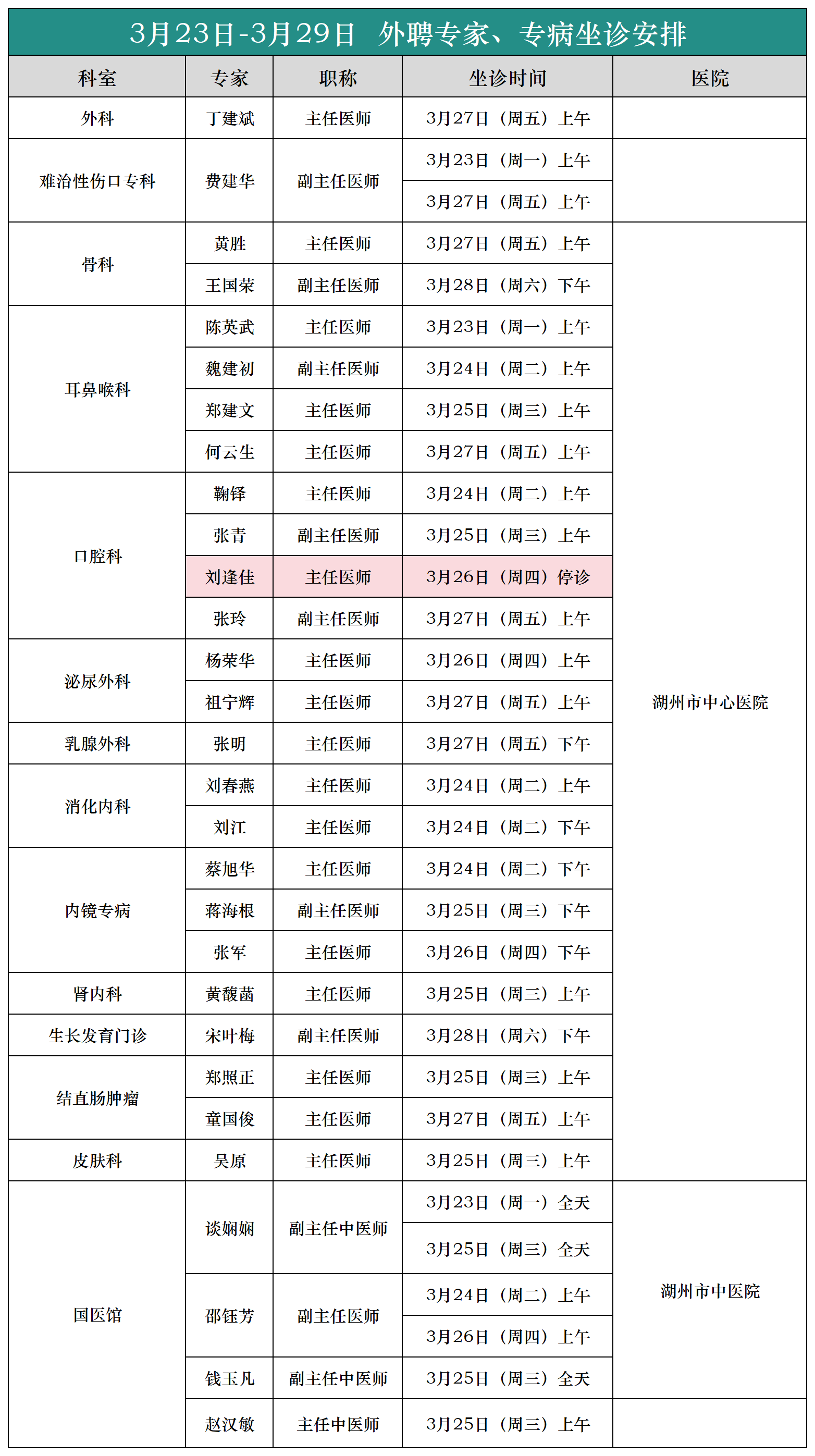 (3月23日-3月29日)外聘专家、专病坐诊安排