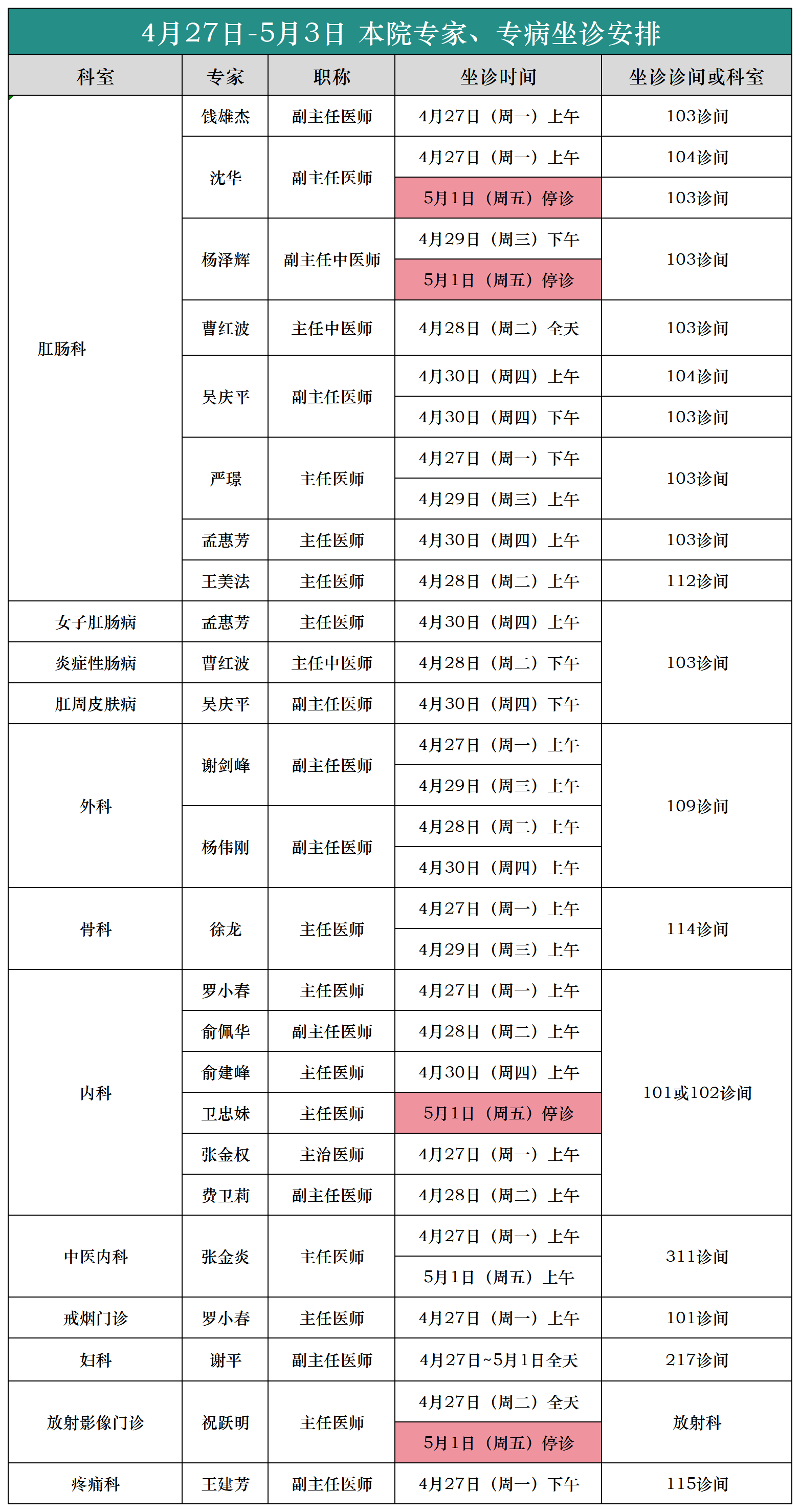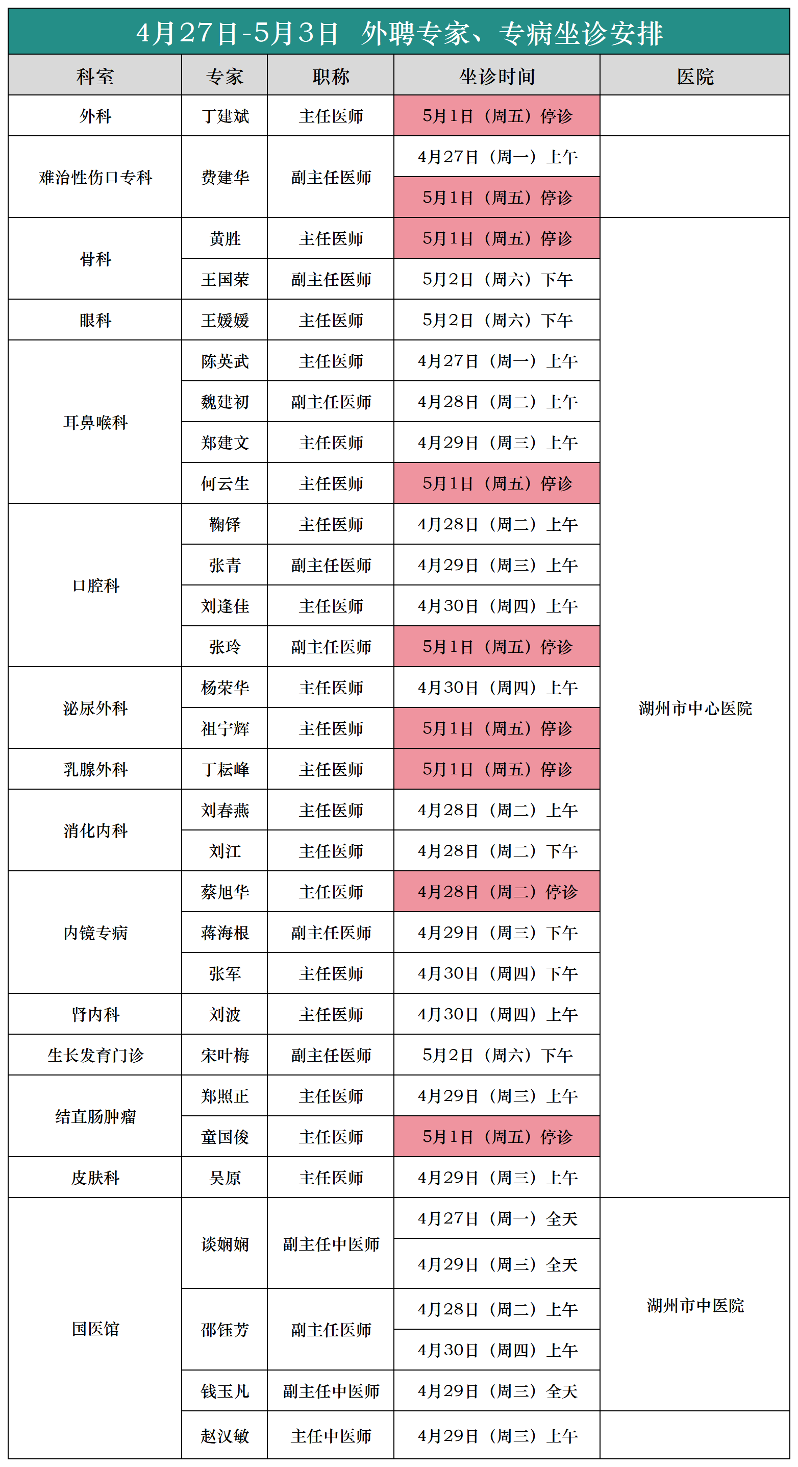(4月27日-5月3日)外聘专家、专病坐诊安排
