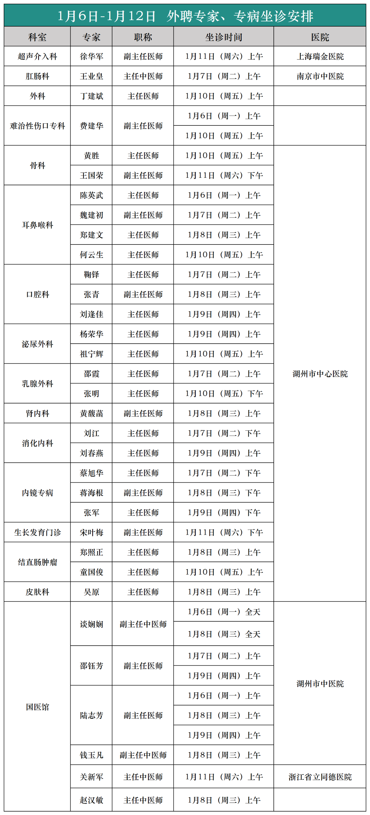 【专家|医讯】吴兴区中西医结合医院下周(1月6日--1月12日)专家、专病门诊安排