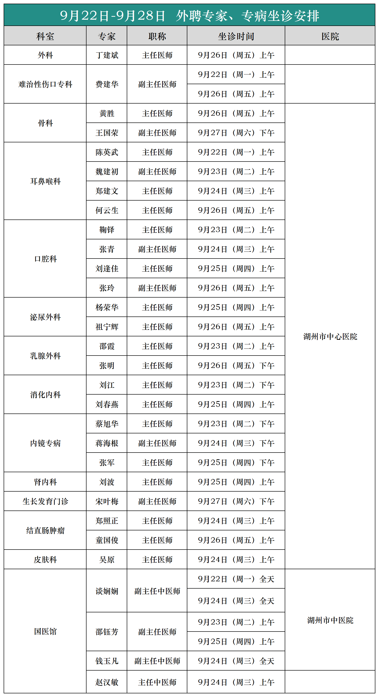 【专家|医讯】吴兴区中西医结合医院(9月22日--9月28日)专家、专病门诊安排