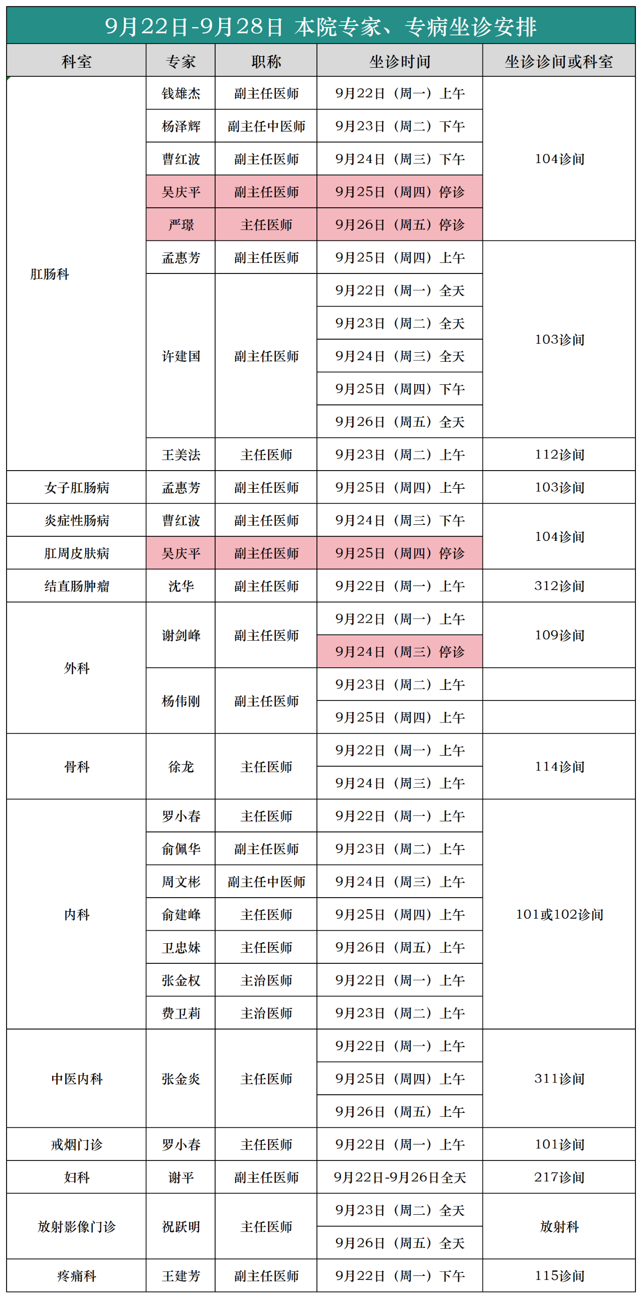 (9月22日-9月28日)外聘专家、专病坐诊安排