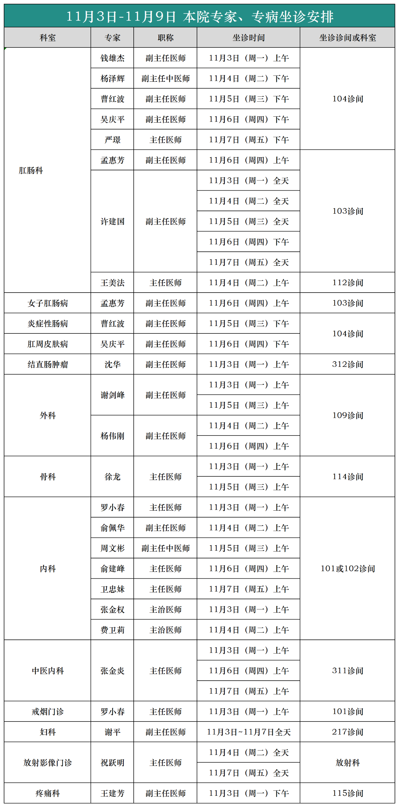 (11月3日-11月9日)外聘专家、专病坐诊安排