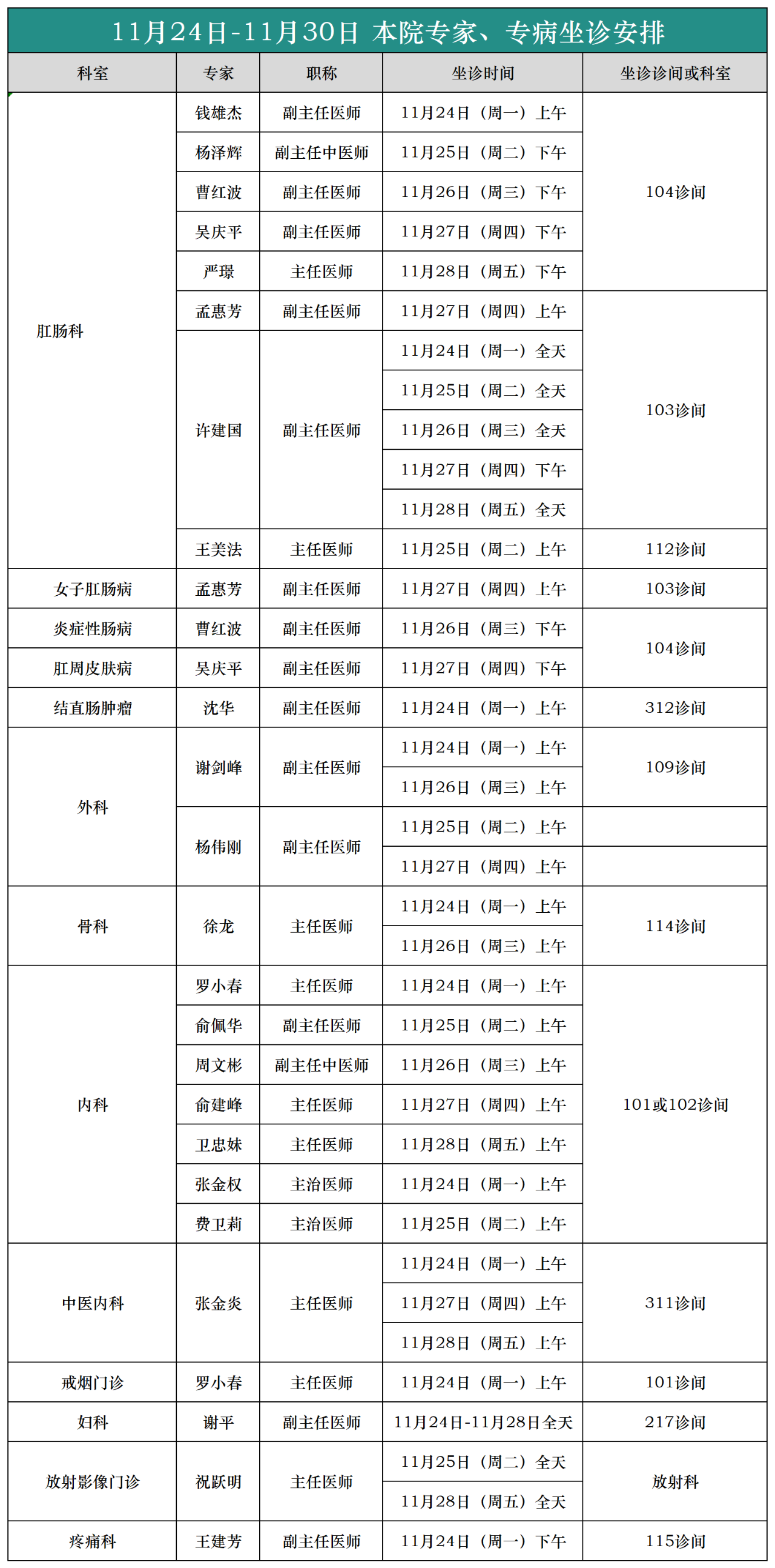 (11月24日-11月30日)外聘专家、专病坐诊安排