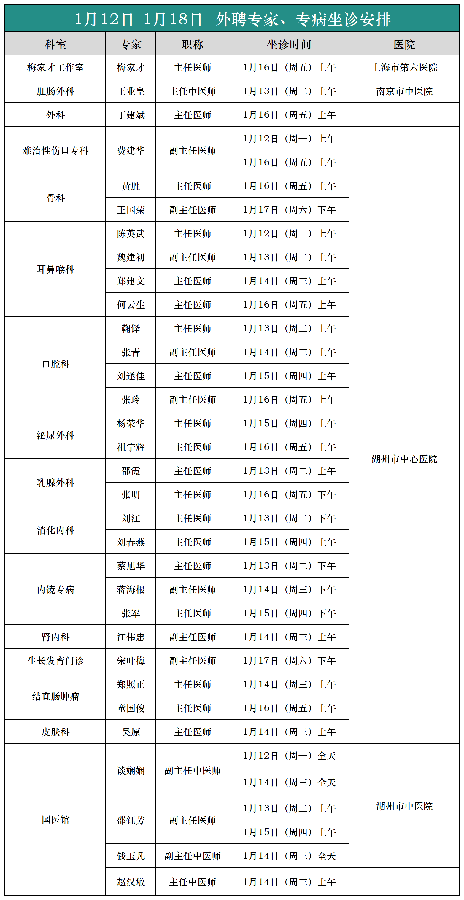【专家|医讯】吴兴区中西医结合医院(1月12日--1月18日)专家、专病门诊安排