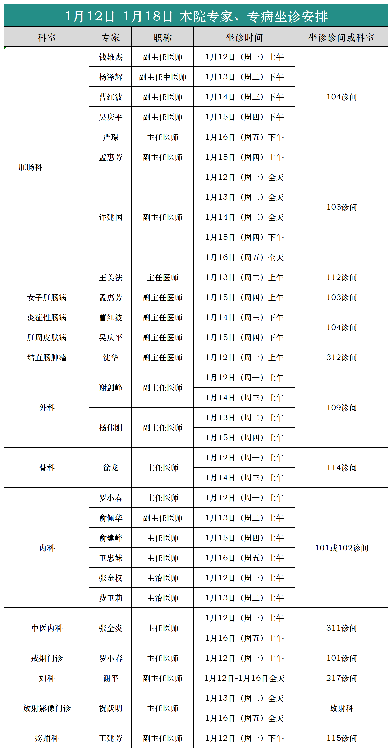 (1月12日-1月18日)外聘专家、专病坐诊安排