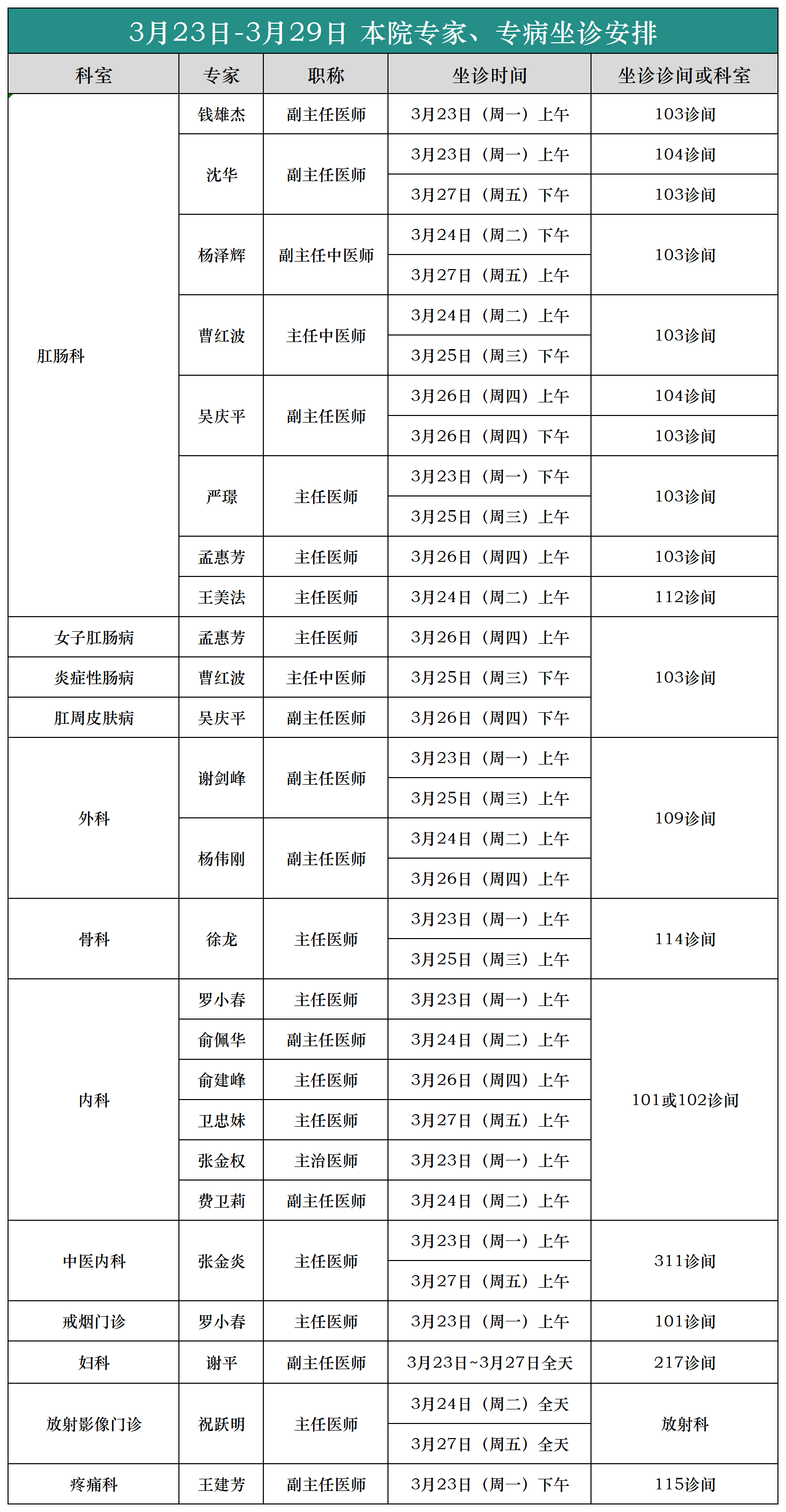 (3月23日-3月29日)外聘专家、专病坐诊安排