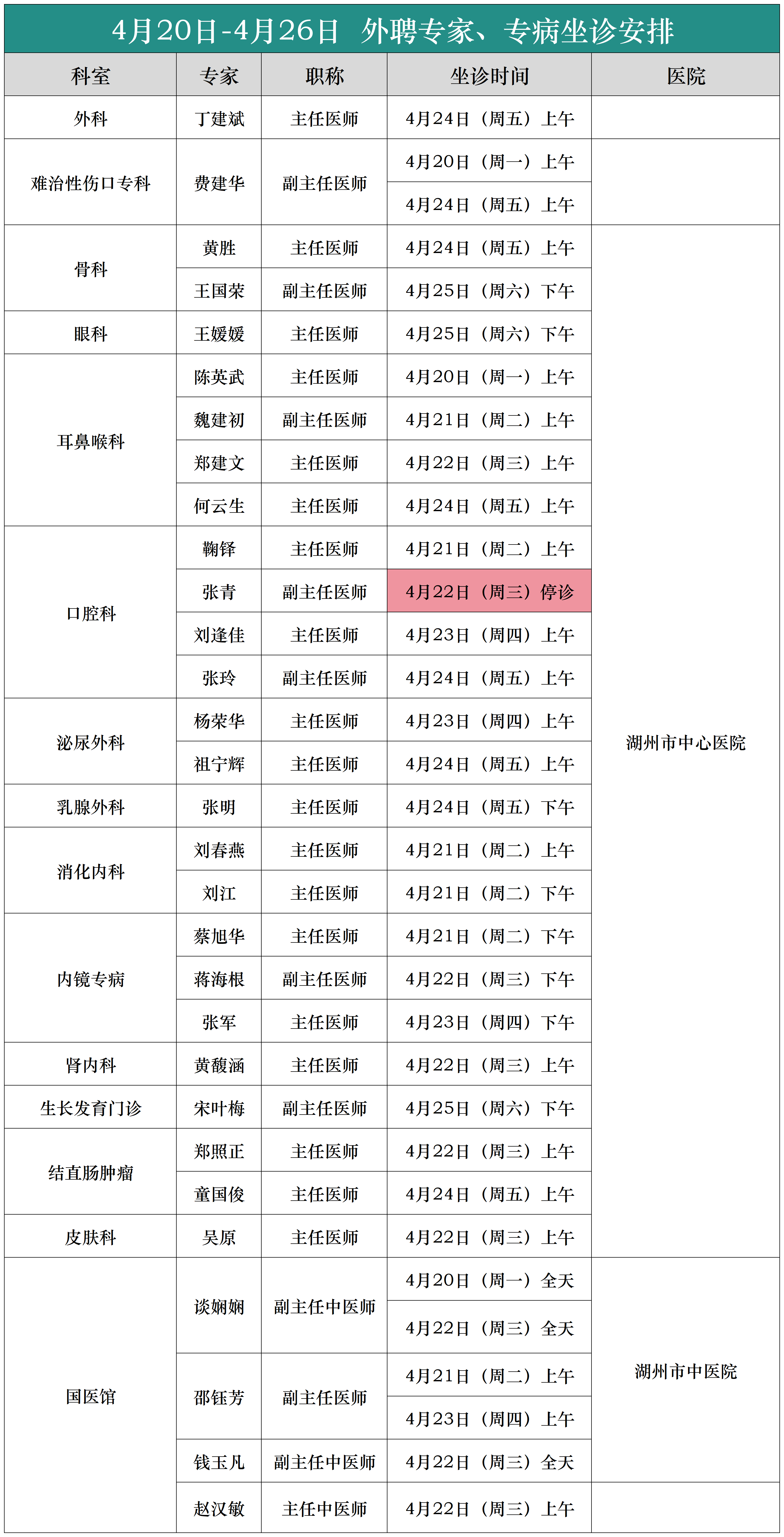 (4月20日-4月26日)外聘专家、专病坐诊安排