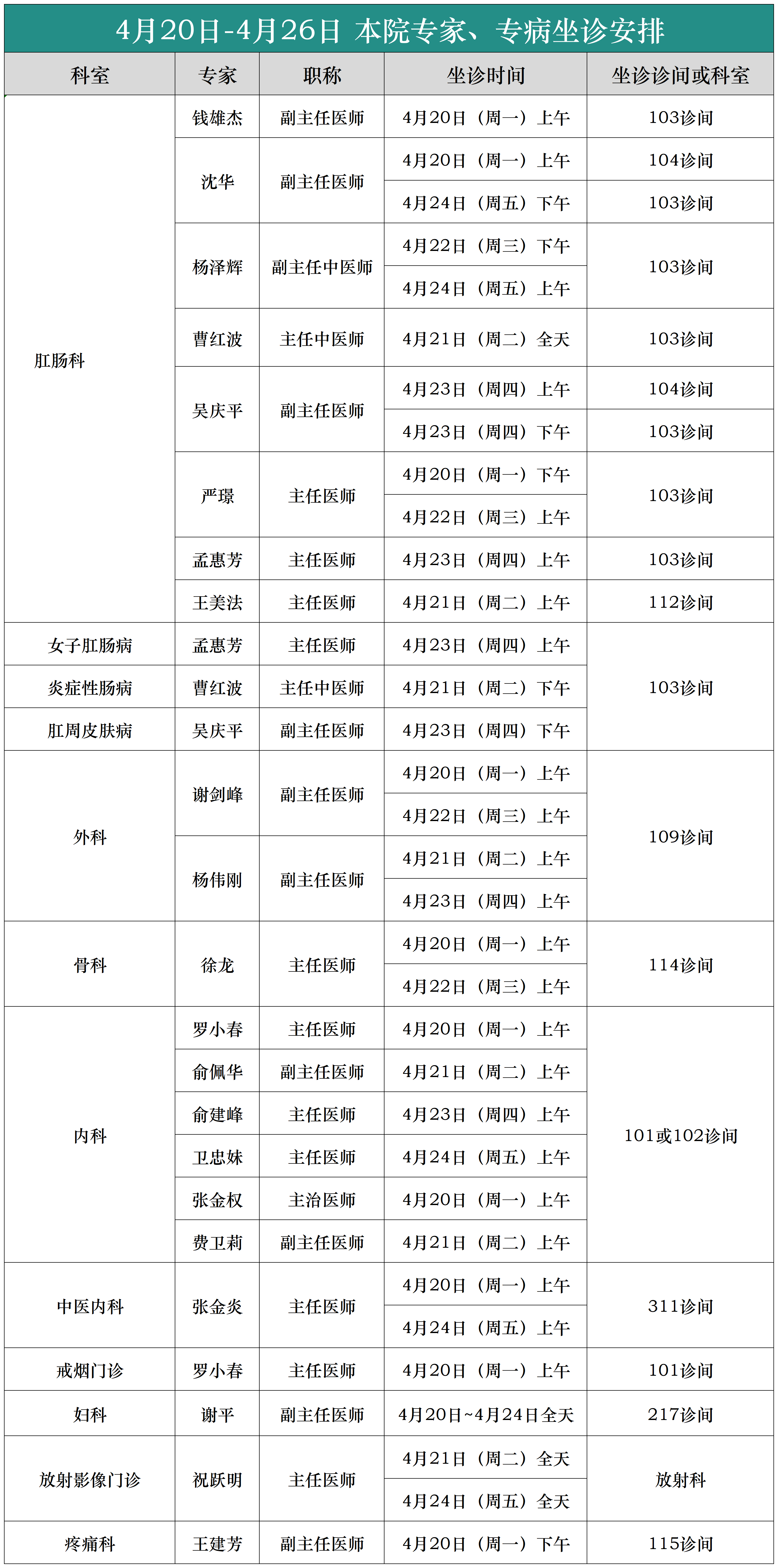 (4月20日-4月26日)本院专家、专病坐诊安排